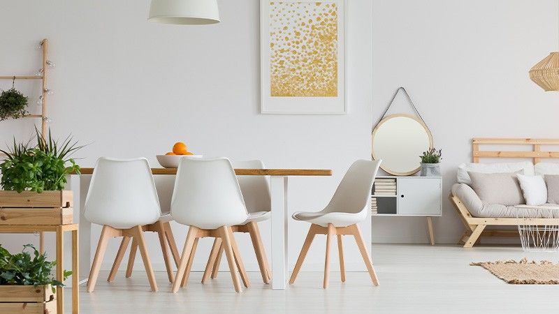 Wyróżnia się tworzeniem bardzo jasnych środowisk z wykończeniami z miękkiego drewna i neutralnymi lub pastelowymi kolorami. Jeśli drewno Twojego stołu ma jasny odcień, doskonałym wyborem będą białe lub pastelowo zielone krzesła do jadalni.