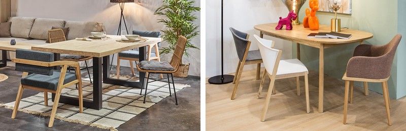 Chociaż jego bazą kolorystyczną jest beż i biel, jest to idealny styl do uzyskania eklektycznej przestrzeni pełen kreatywności. Na przykład stoły do jadalni z białego lub jasnego drewna można połączyć z krzesłami w jasnych kolorach lub z nadrukowanymi motywami.