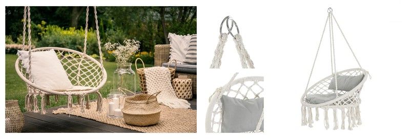 Czy mają zalety? Oczywiście wiszące krzesła do domu oferują Ci dodatkową dawkę komfortu. Udowodniono naukowo, że kiedy siedzisz na tym meblu i cieszysz się jego lekkim kołysaniem, zachęca to do rozluźnienia mięśni, pomagając w pojednaniu i stymulacja głębokiego snu.